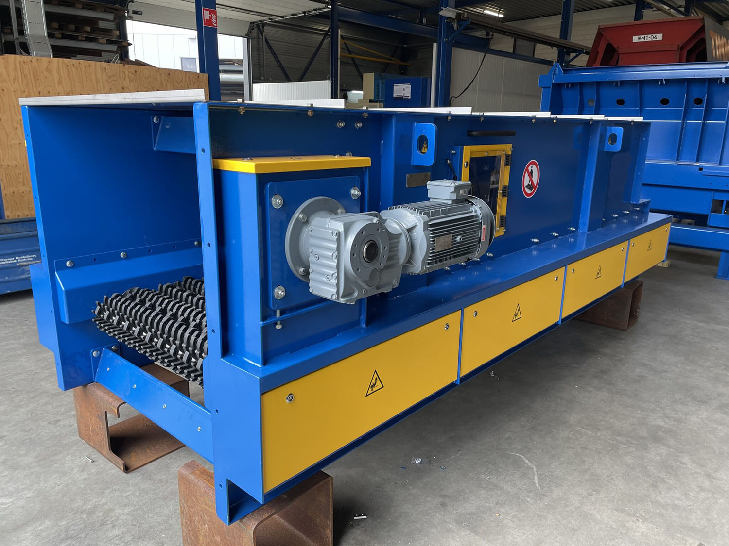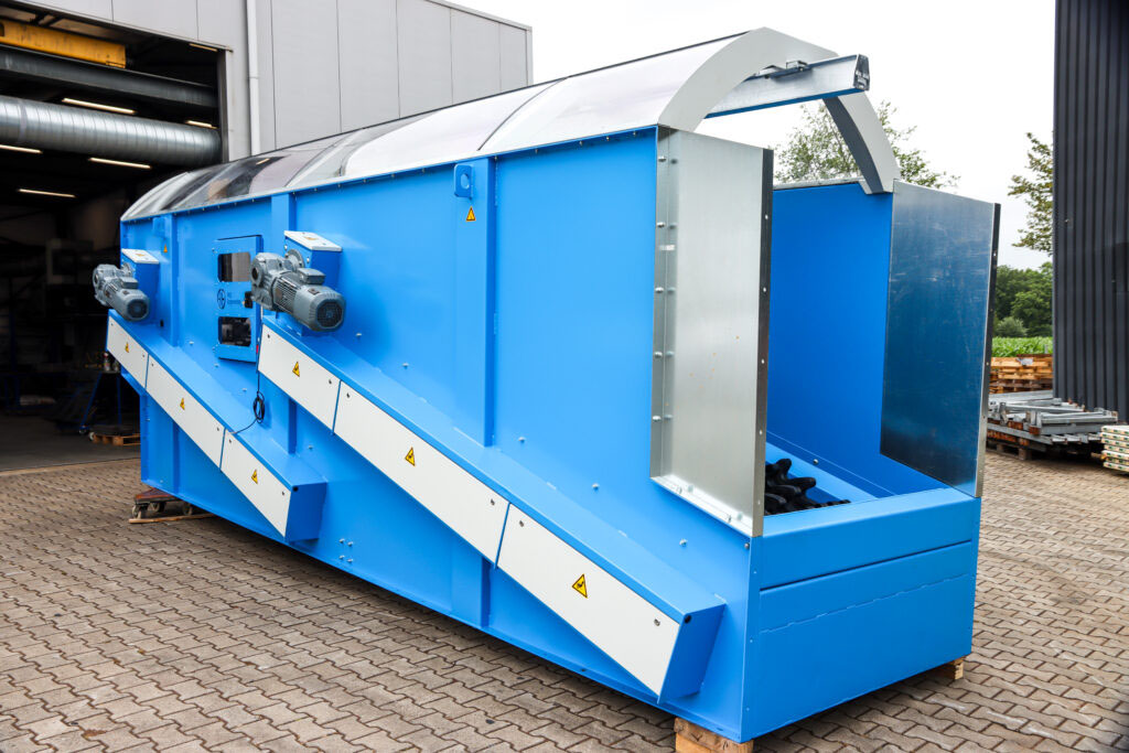 This STS screen with its large starts is used to separate spent mushroom compost from branches or roots. This screen is also equipped with the special “hammers” to prevent blockages of the screen.