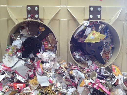 The ACA crusher separates the wrapping from the foodstuffs, e.g. chocolate, chips, bread, fruit, etc. for subsequent recycling. After eliminating the wrapping, the foodstuffs can be recycled as animal feed or biomass.