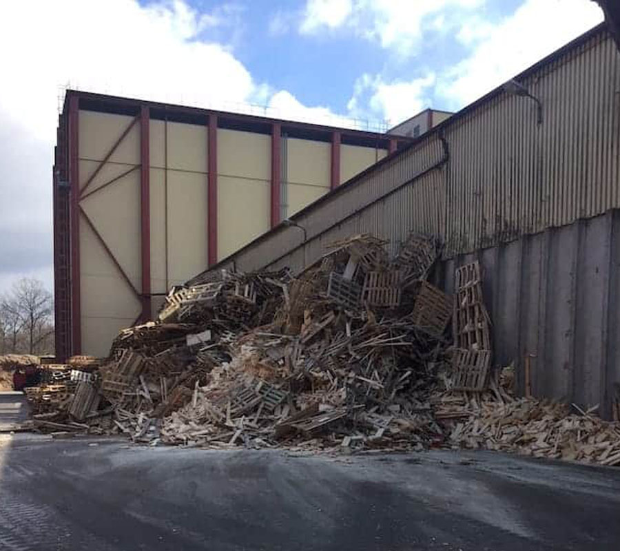 Input of wood waste / pallets / wood / crushed wood ready for crushing.