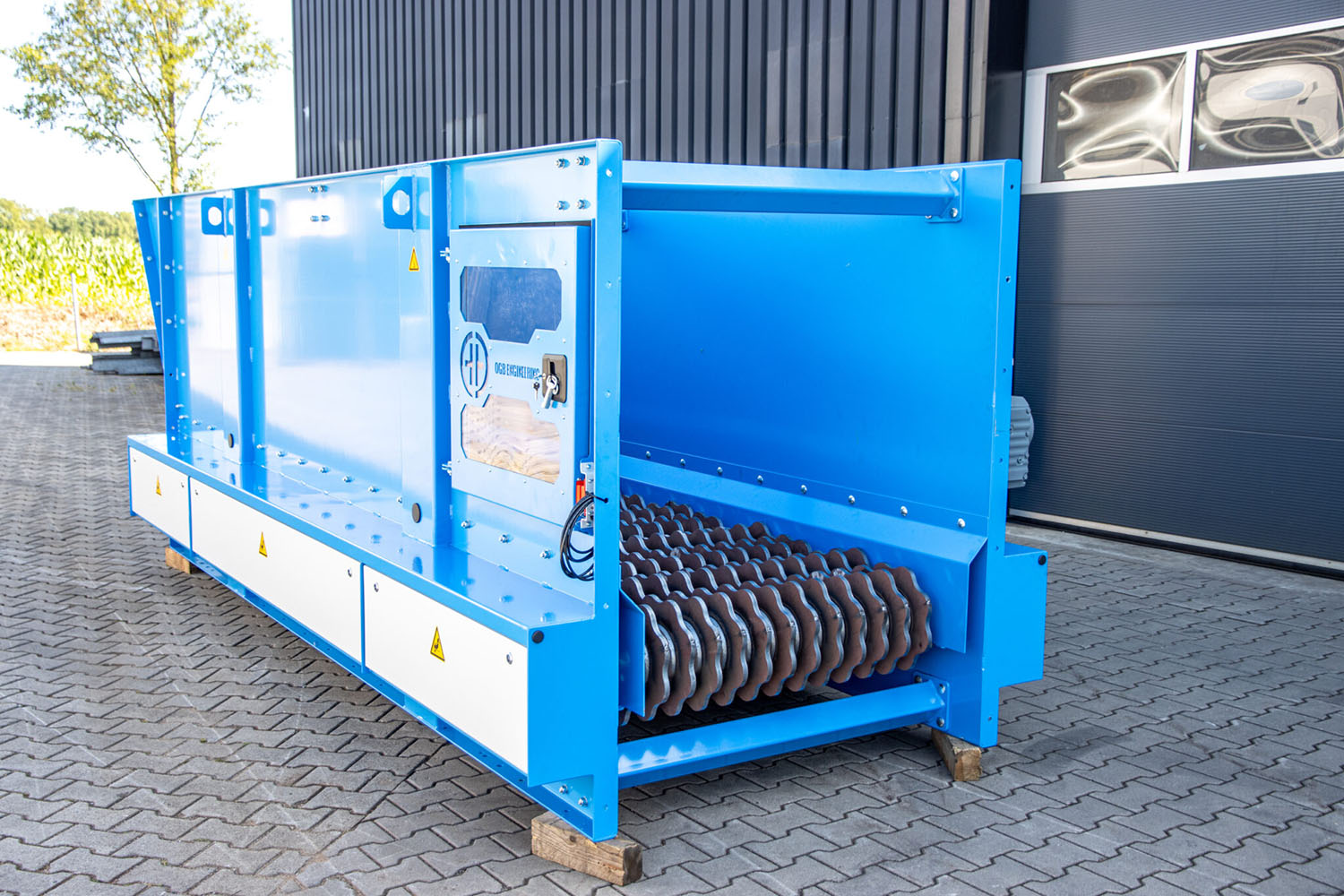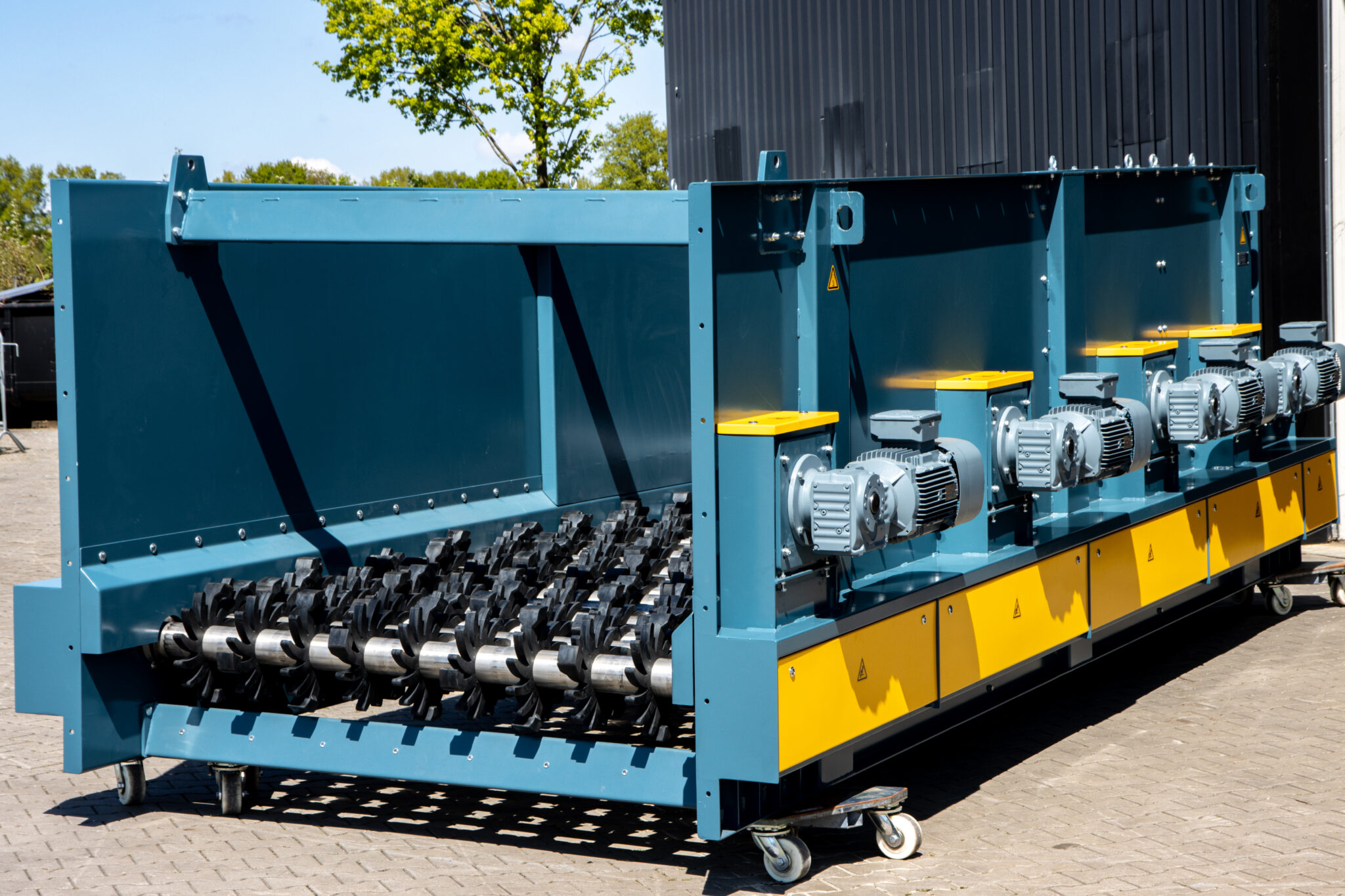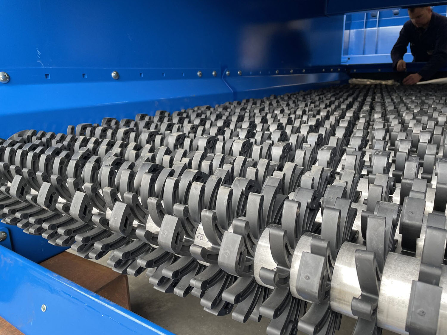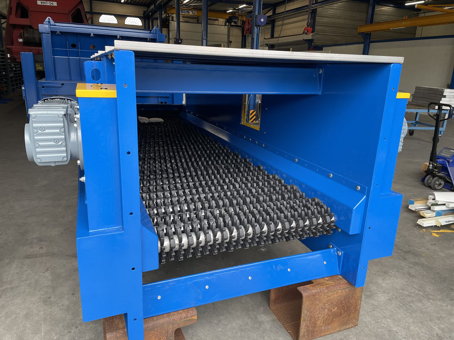 This STS screen with its large starts is used to separate spent mushroom compost from branches or roots. This screen is also equipped with the special “hammers” to prevent blockages of the screen.