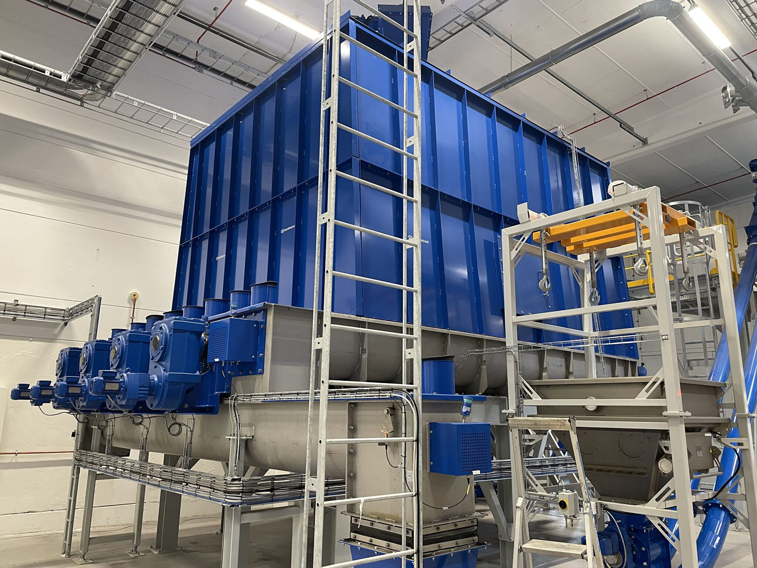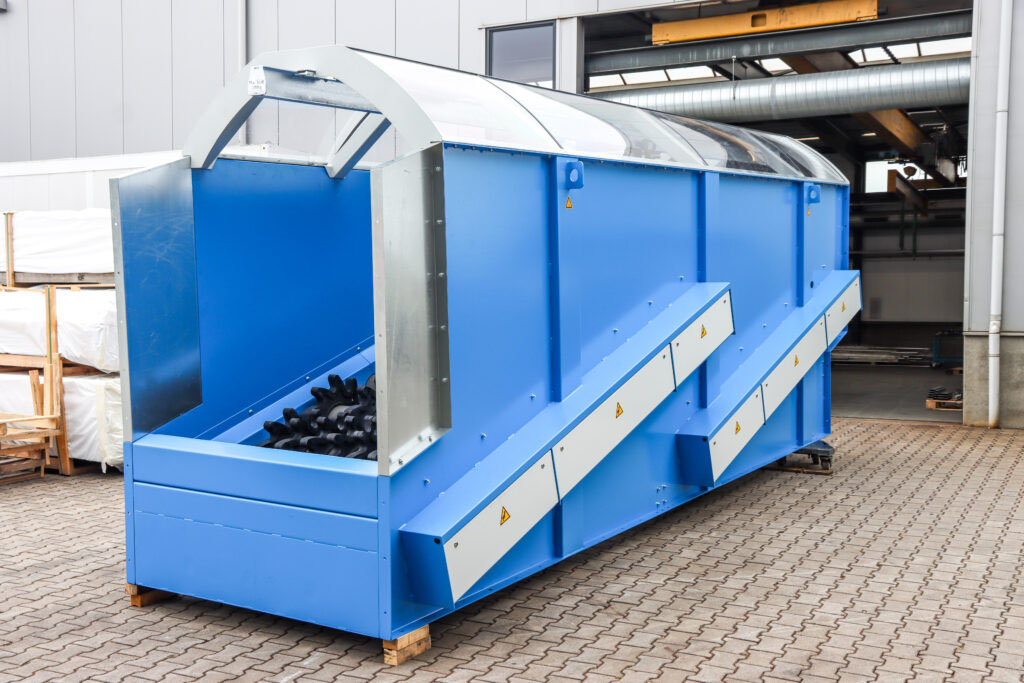 This 60m3 bunker has been installed at a Swedish recycling plant. Along with 4 screw conveyors it will store and transport shredded EV battery’s. The purpose is to extract the valuable metals and recycle them.